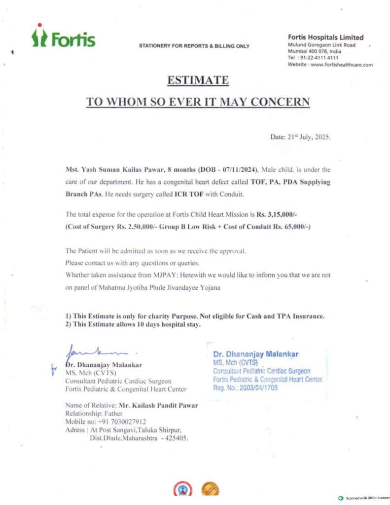 The cost of the surgery is ₹3,15,000, and his family cannot afford it. Mr. Kailash Pandit Pawar is father of the child. He is currently residing at Post Sangavi, Taluka Shirpurt, Dist Dhule, State Maharashtra 425405. He is doing “Labour” & his annual income is Rs. 30,000/-. His wife is a home maker. They have 2 children, Mst. Yash is their son and also our patient, who is suffering from the above-mentioned disease.