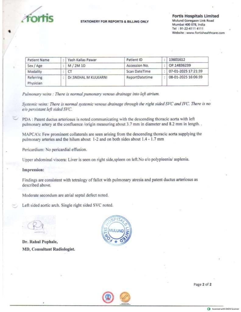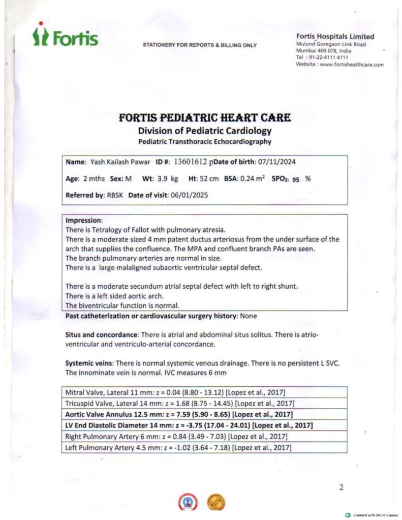 Mst. Yash Suman Kailash Pawar is having the above disease by birth. Patient was having bit of discomfort and weakness, as a result of which his parents consulted with doctor at Dhuke, State Maharashtra. Patient referred to Pediatric Cardiac Dept Fortis Hospital Mumbai. And child confirmed with Heart defect and suggested for immediate treatment.